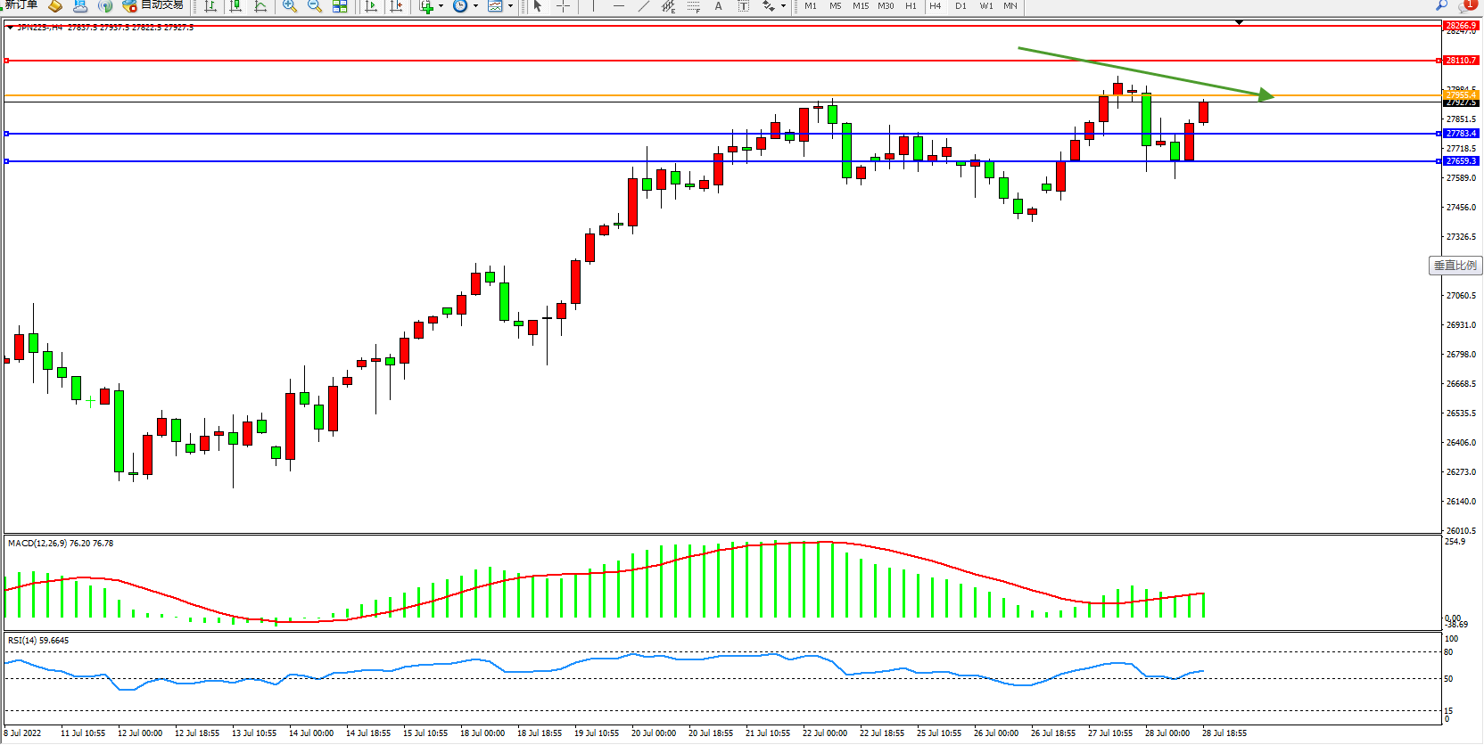 日经指数JPN225——4小时K线图显示: