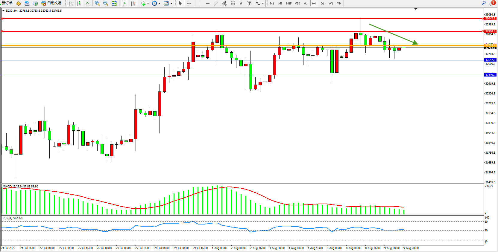 道琼斯指数DJ30——4小时K线图显示: