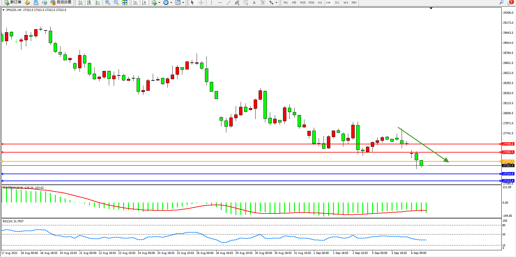 日经指数JPN225——4小时K线图显示:
