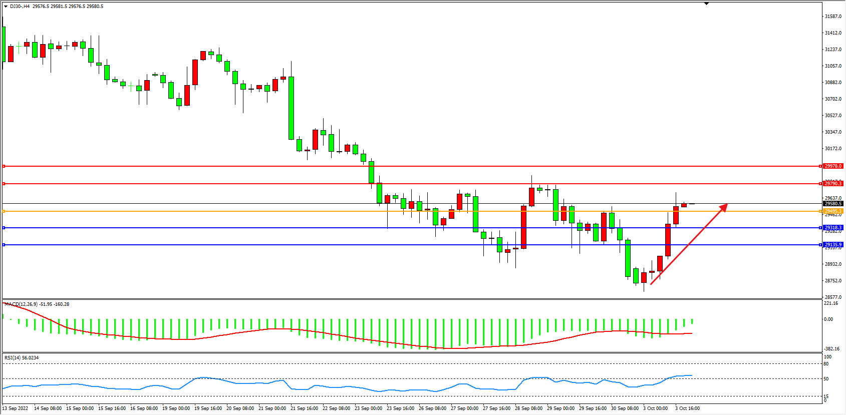 道琼斯指数DJ30——4小时K线图显示: