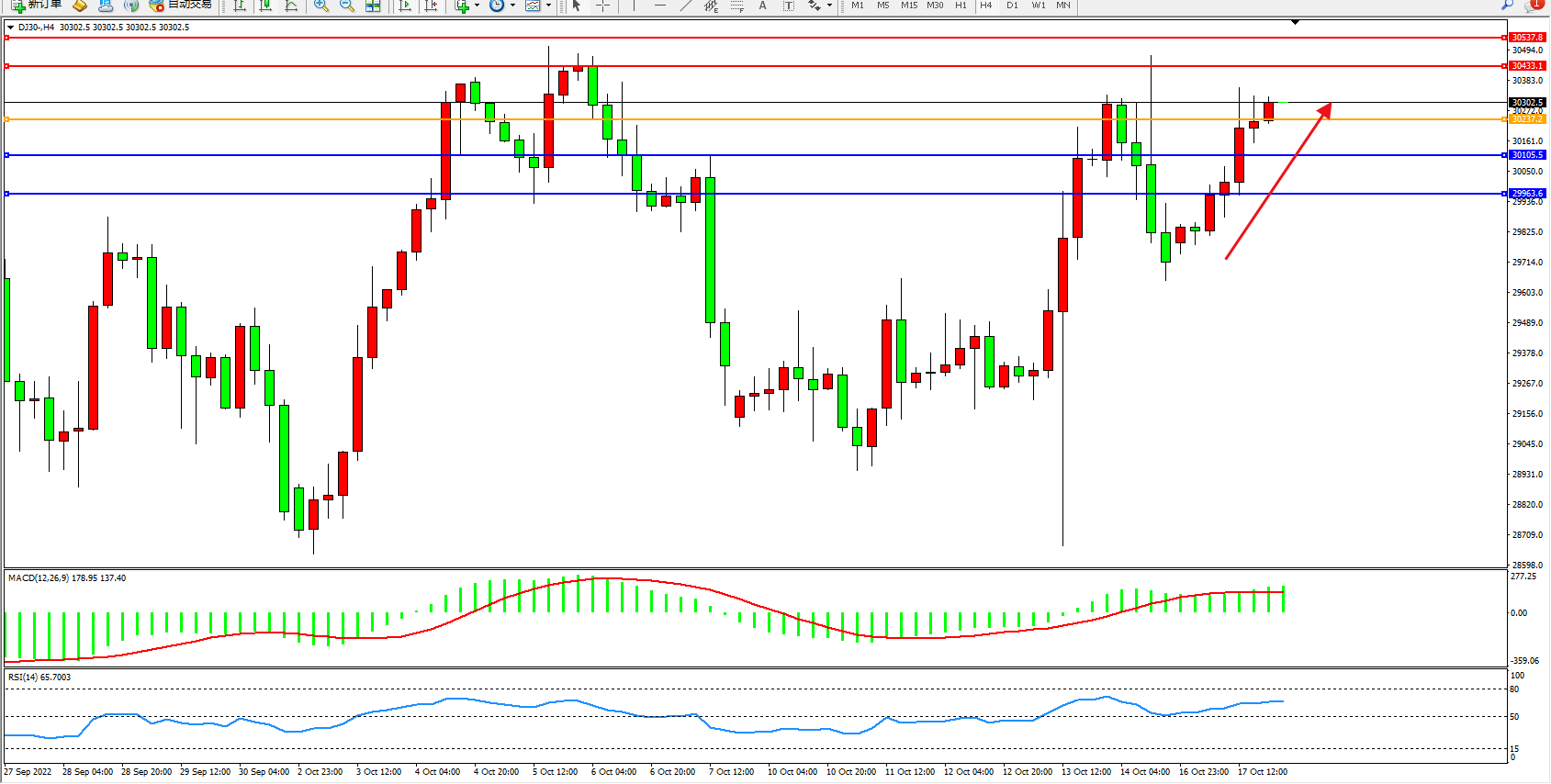 道琼斯指数DJ30——4小时K线图显示: