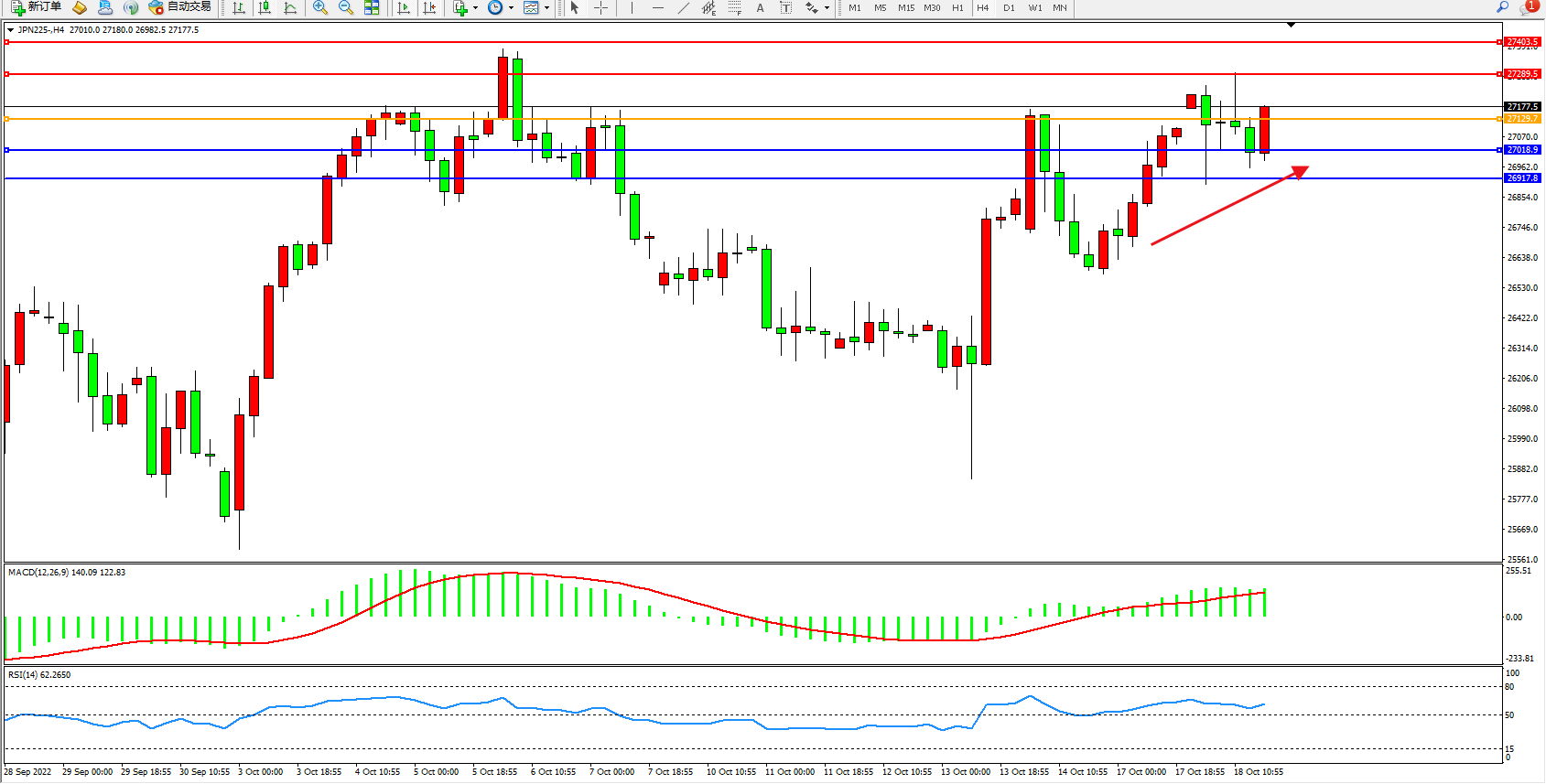 日经指数JPN225——4小时K线图显示: