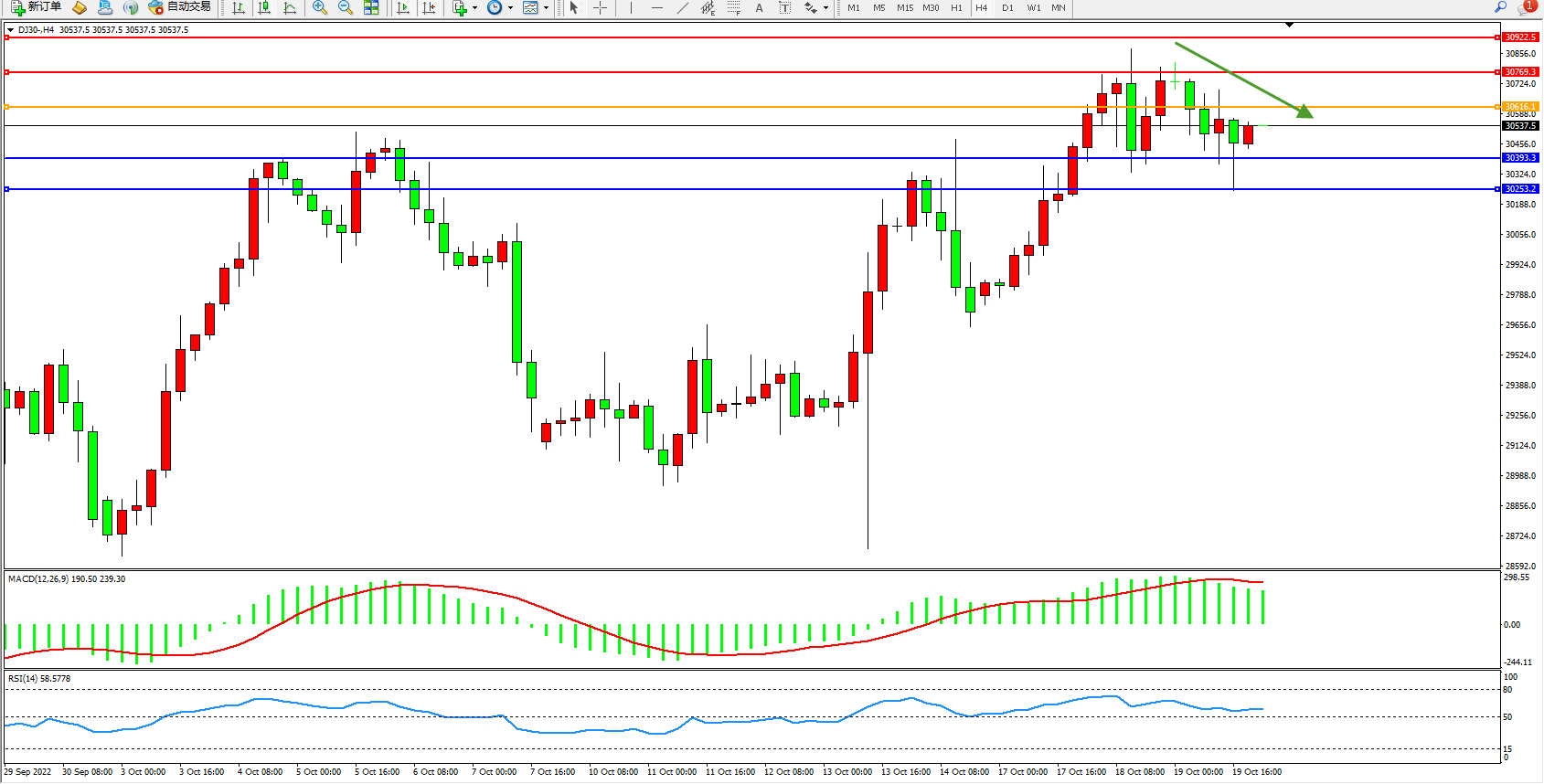 道琼斯指数DJ30——4小时K线图显示: