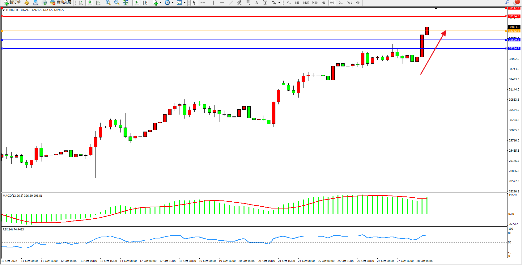 道琼斯指数DJ30——4小时K线图显示: