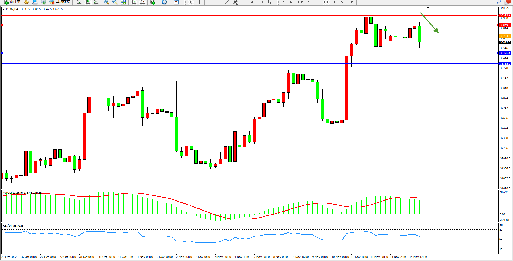 道琼斯指数DJ30——4小时K线图显示: