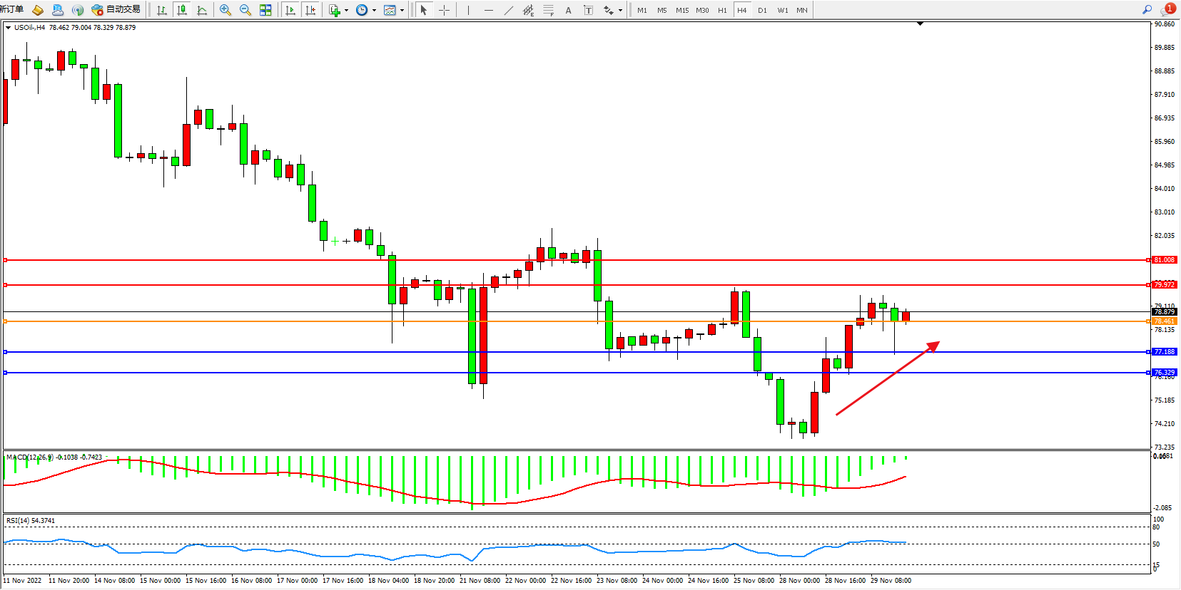 备选策略:78.461上方看涨,目标79.972、81.008