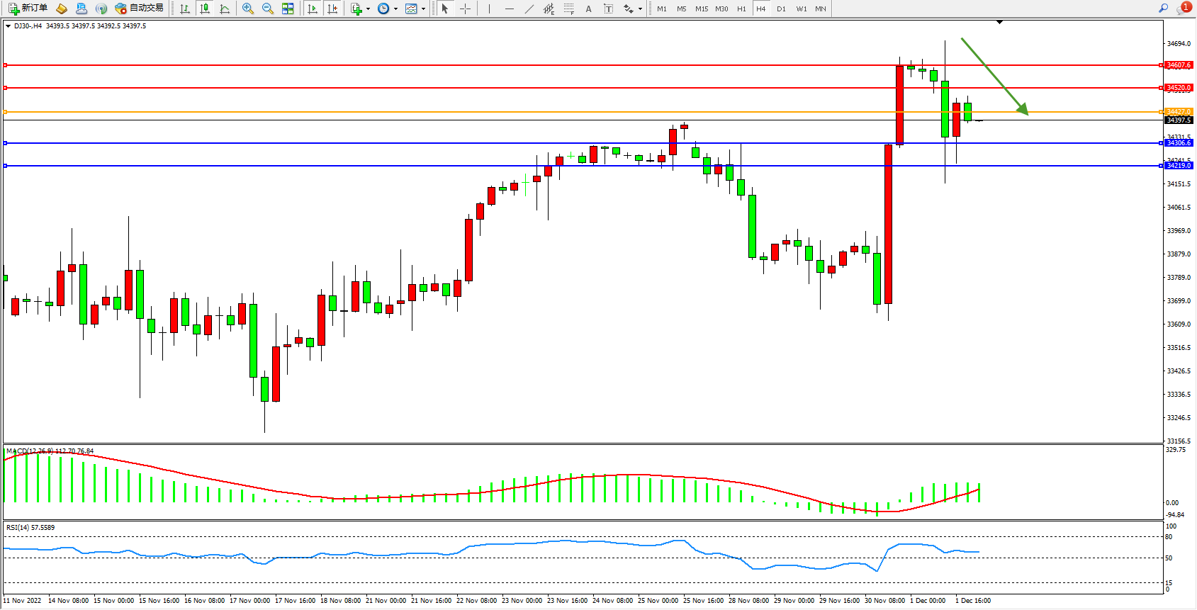道琼斯指数DJ30——4小时K线图显示: