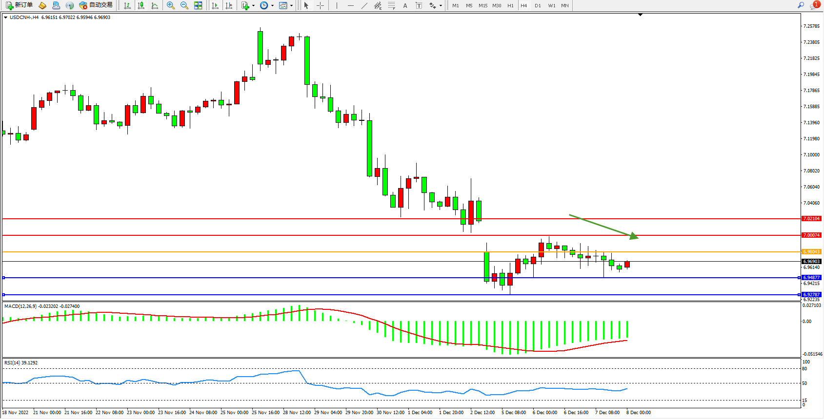 美元人民币USDCNH——4小时K线图显示: