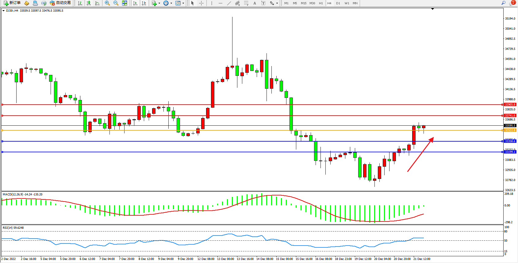 道琼斯指数DJ30——4小时K线图显示: