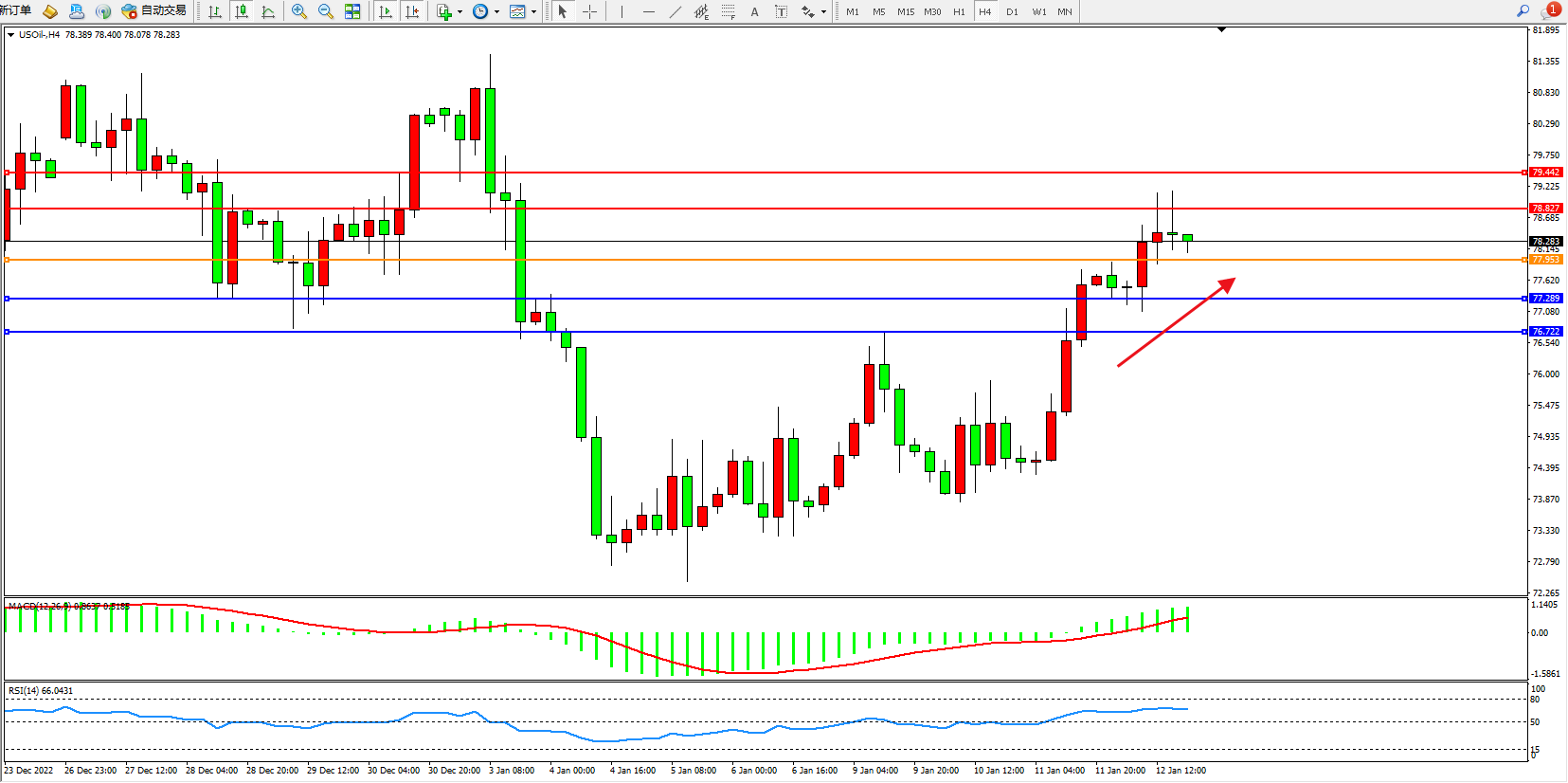 原油USOil——4小时K线图显示: