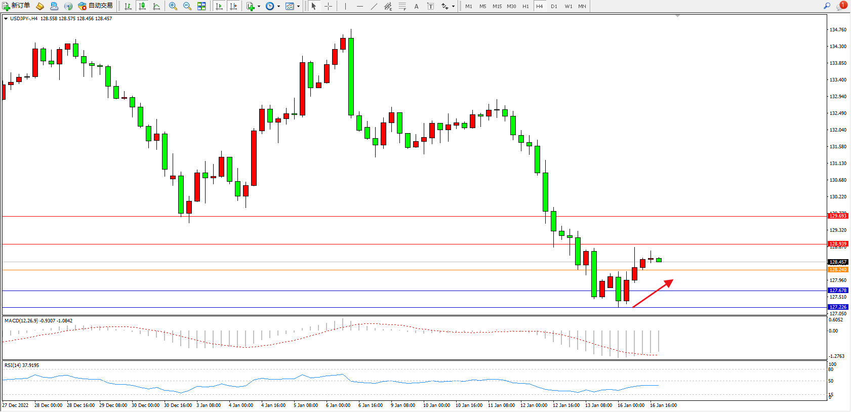 交易策略:128.240上方看涨,目标128.939、129.693