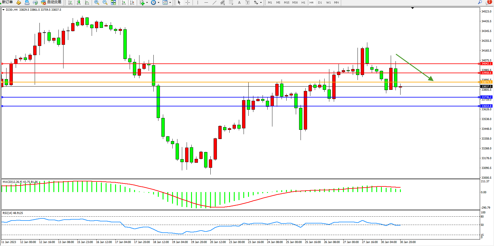 道琼斯指数DJ30——4小时K线图显示: