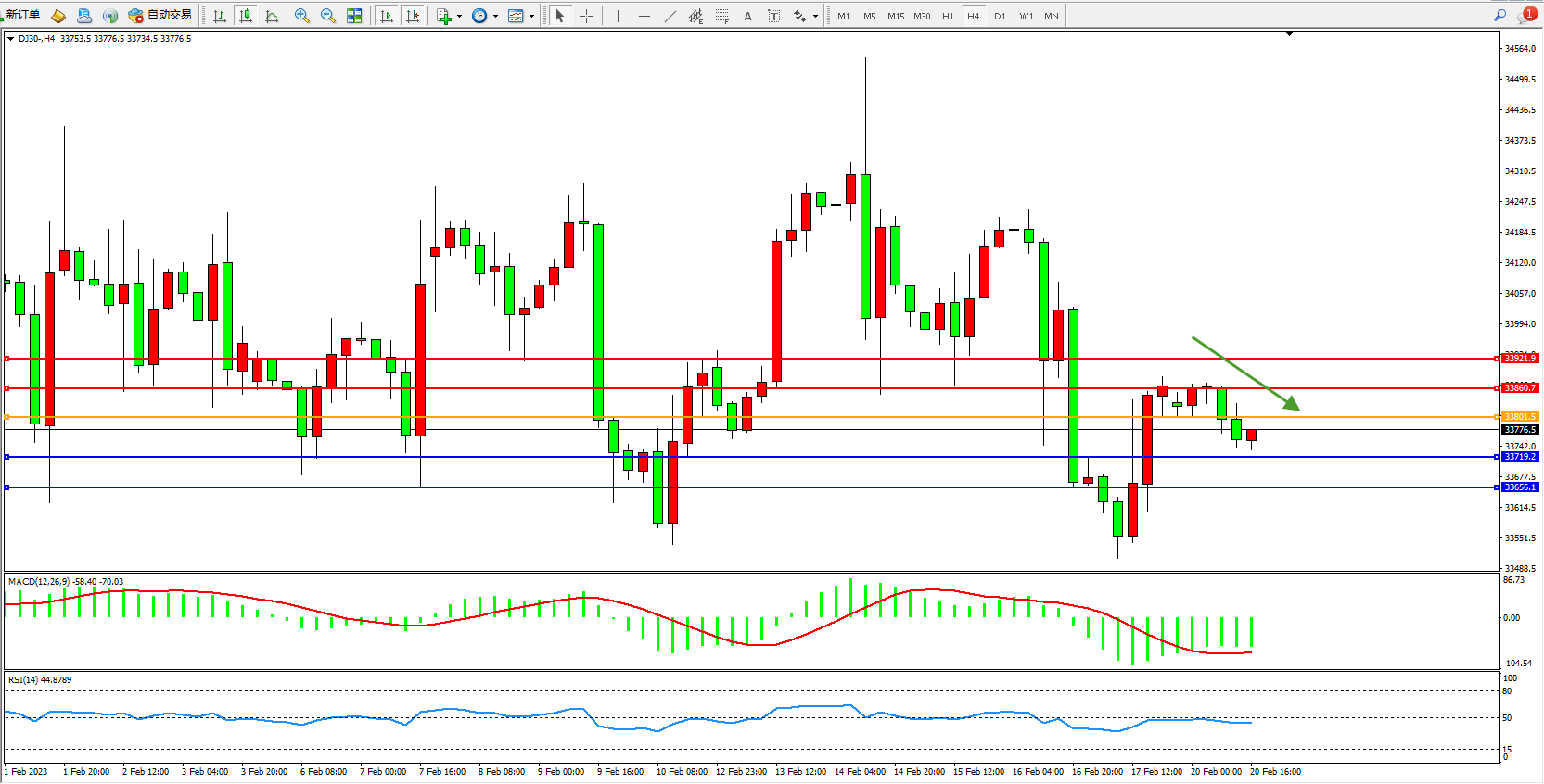 道琼斯指数DJ30——4小时K线图显示: