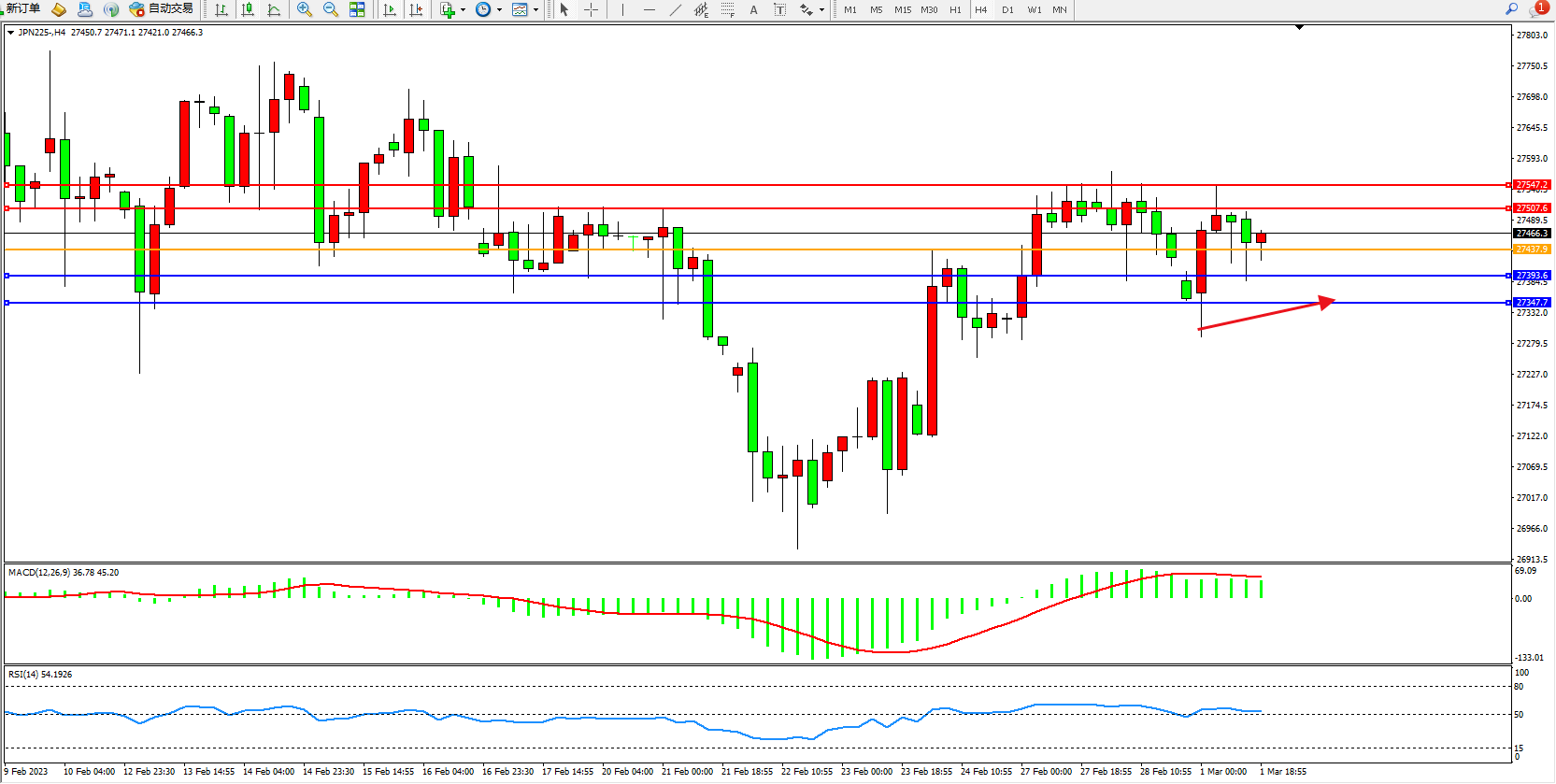 日经指数JPN225——4小时K线图显示:
