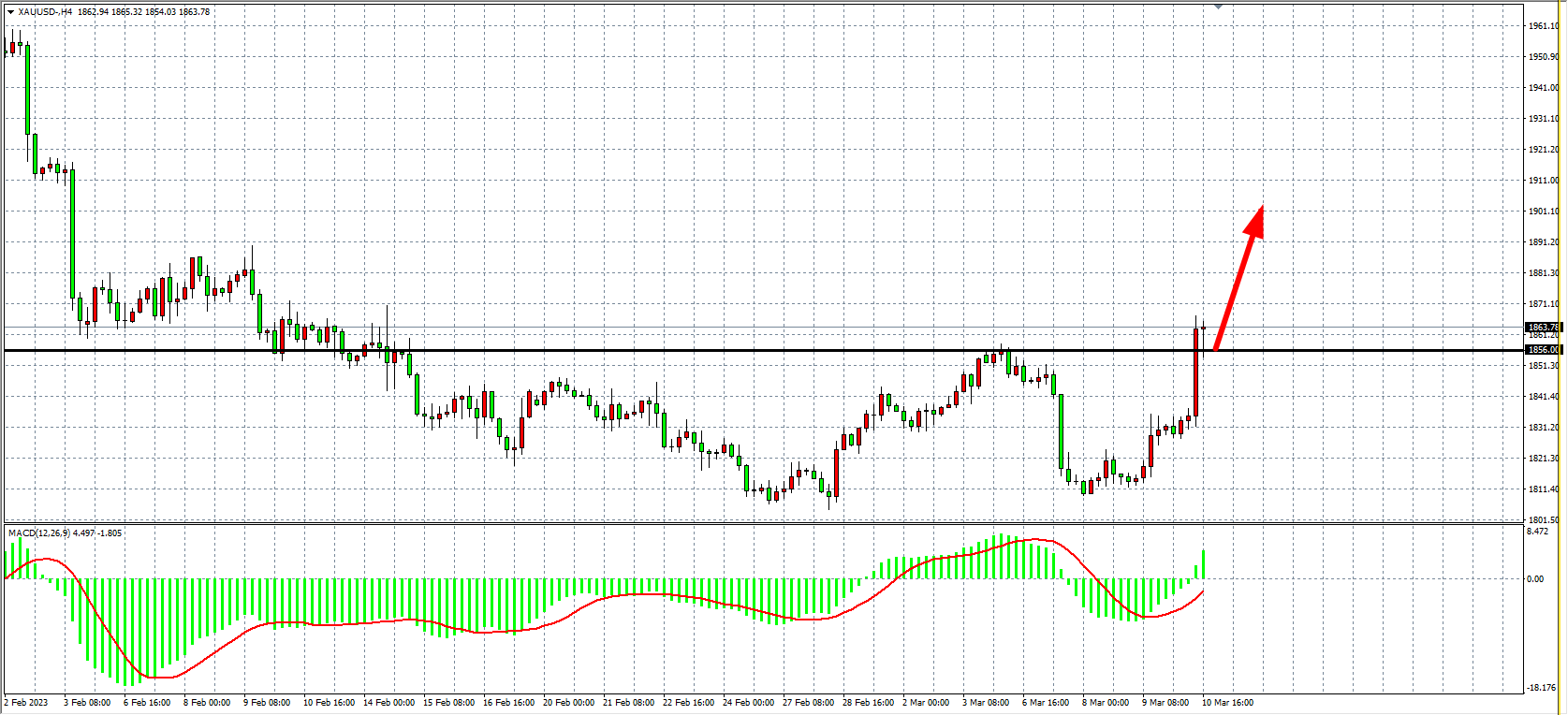 4小时图看,金价强势上涨至1860之上,多头出现加速,同时MACD在零轴之上迅速放量,多头有望在短期内延续强势,当前支撑关注1856,日内在该位之上继续看涨,上方目标1880-1900。