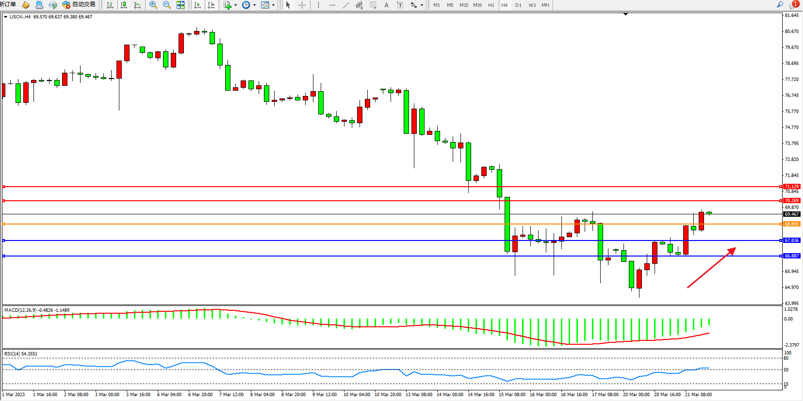原油维持69.467附近震荡,由于石油的基本面因素,所有的价格预测都是年底前油价将上涨。但这些预测的基础是在银行倒闭和瑞士信贷接受纾困之前。