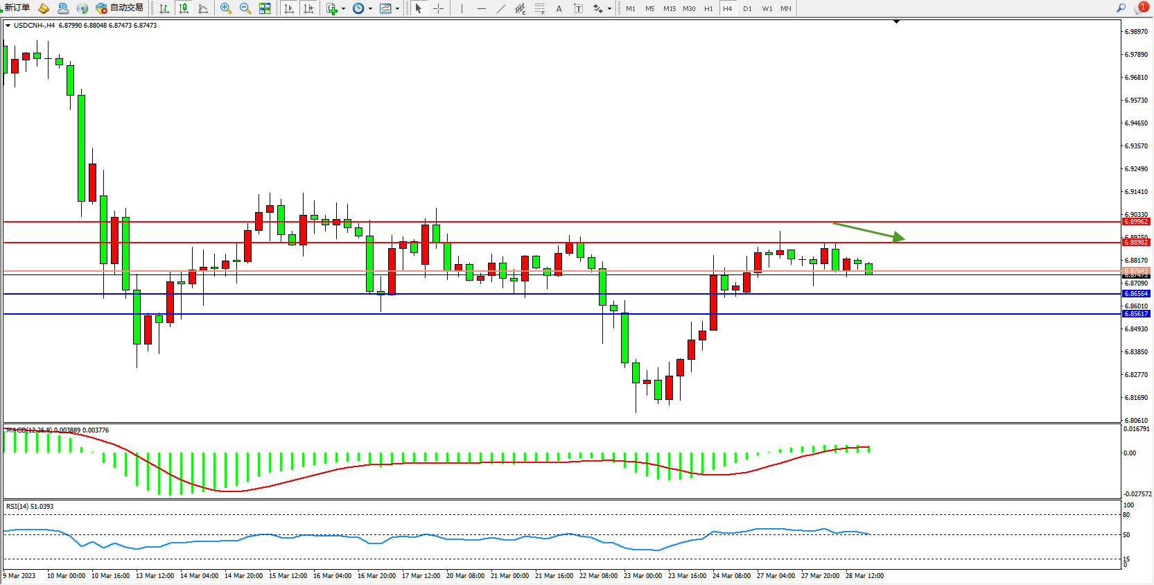 美元人民币USDCNH——4小时K线图显示:
