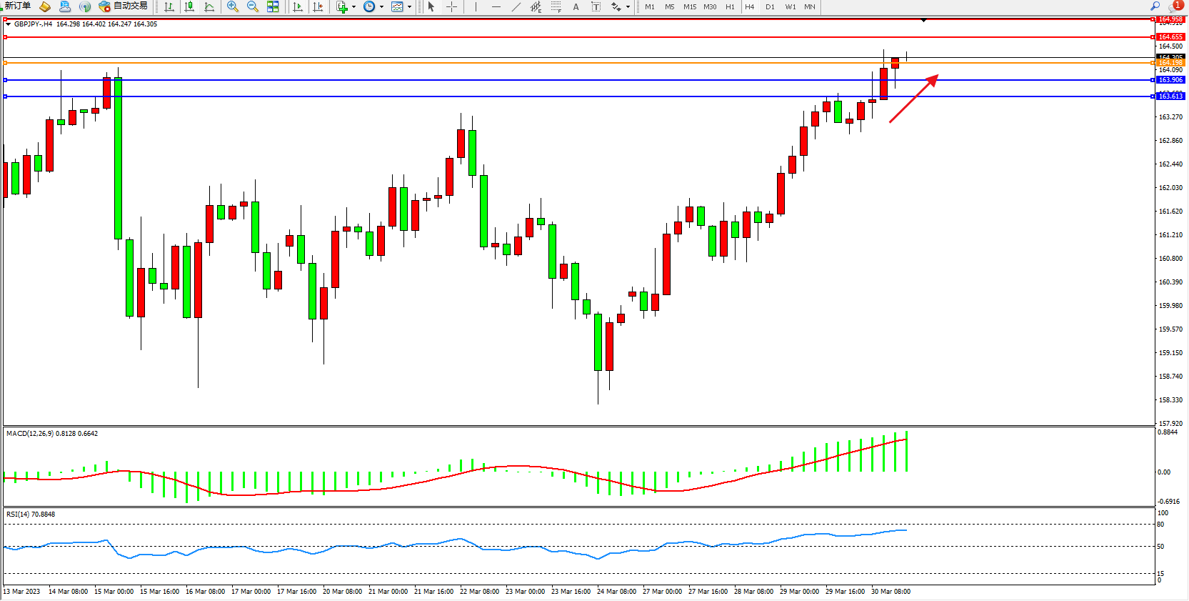 4小时图看:高位多头动力维持震荡上扬,短期看涨情绪涌现,市场多头不断向上拉升中,MACD指标处于多头区域高位徘徊,RSI指标处于多头区域高位整理;