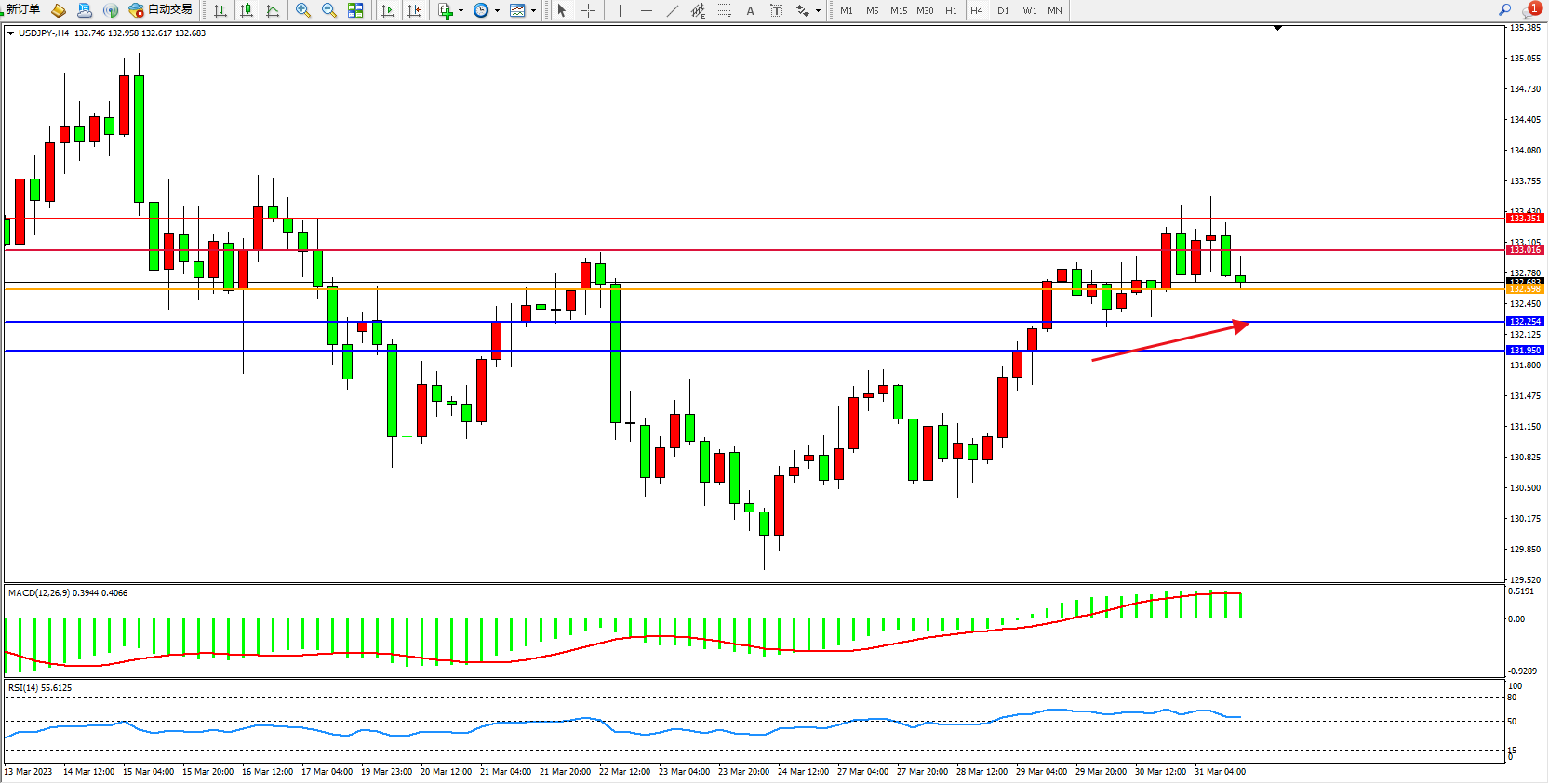 交易策略:132.598上方看涨,目标133.016  133.351