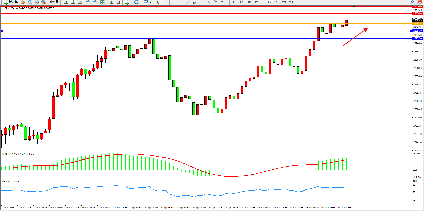 日经指数JPN225——4小时K线图显示: