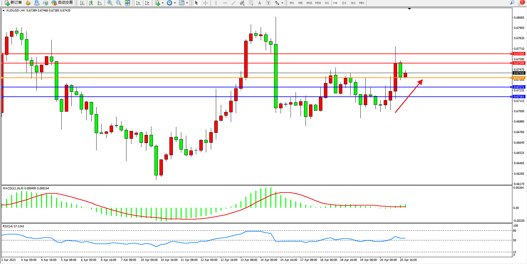 备选策略:0.67377上方看涨,目标0.67544 0.67650