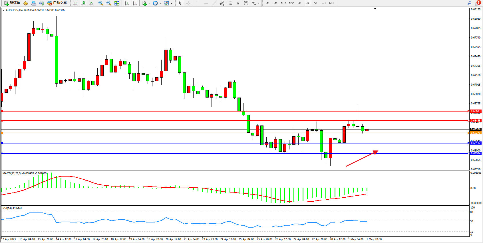 交易策略:0.66270上方看涨,目标0.66458  0.66603