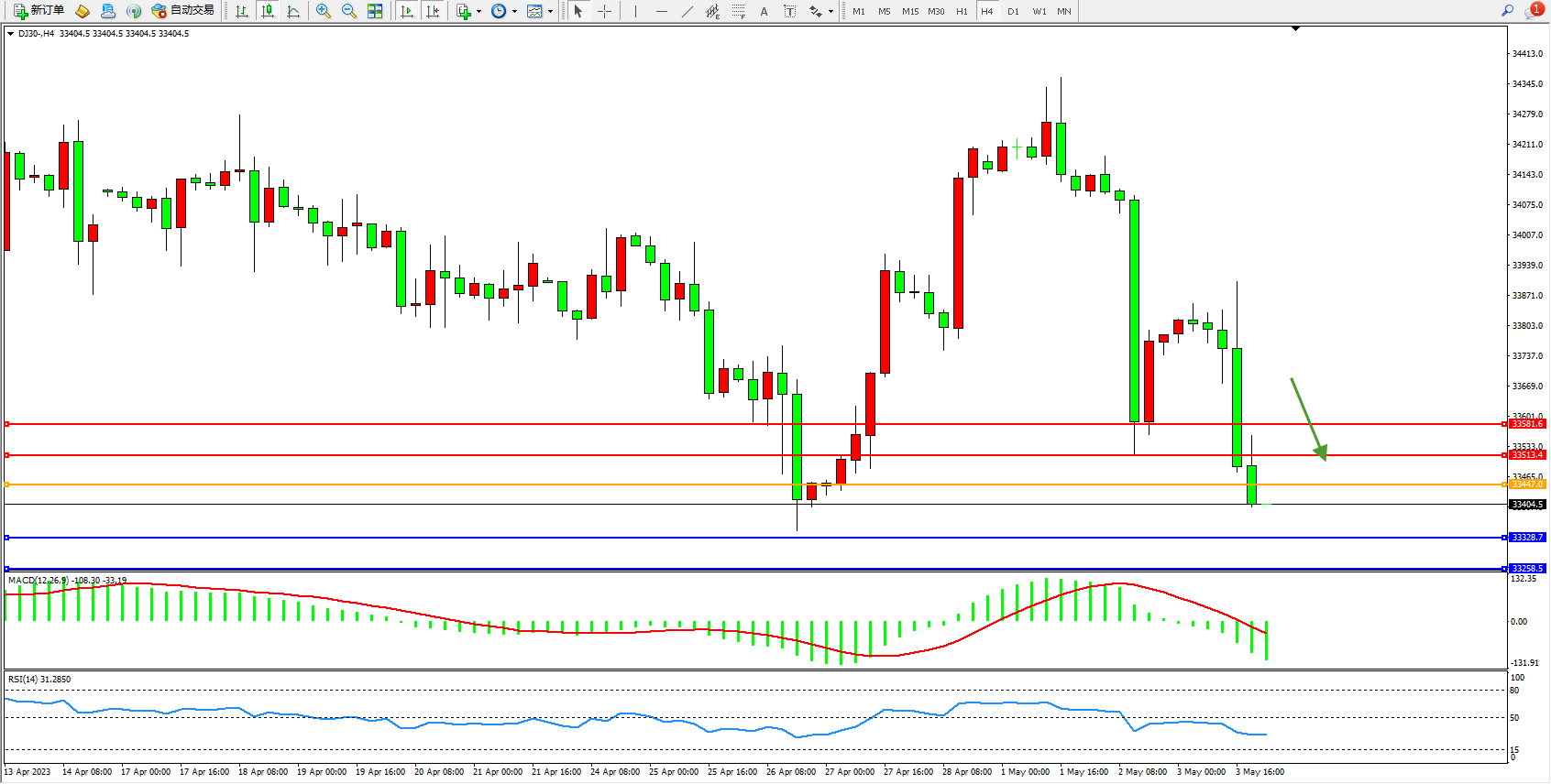 道琼斯指数DJ30——4小时K线图显示: