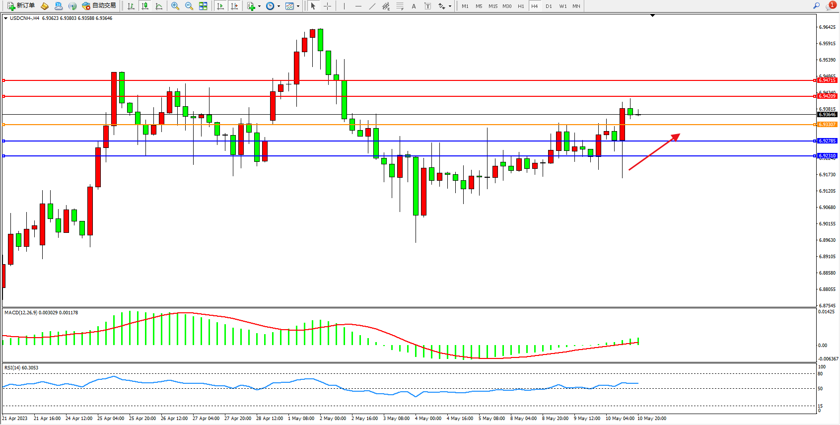 交易策略:6.93307上方看涨,目标6.94209 6.94715