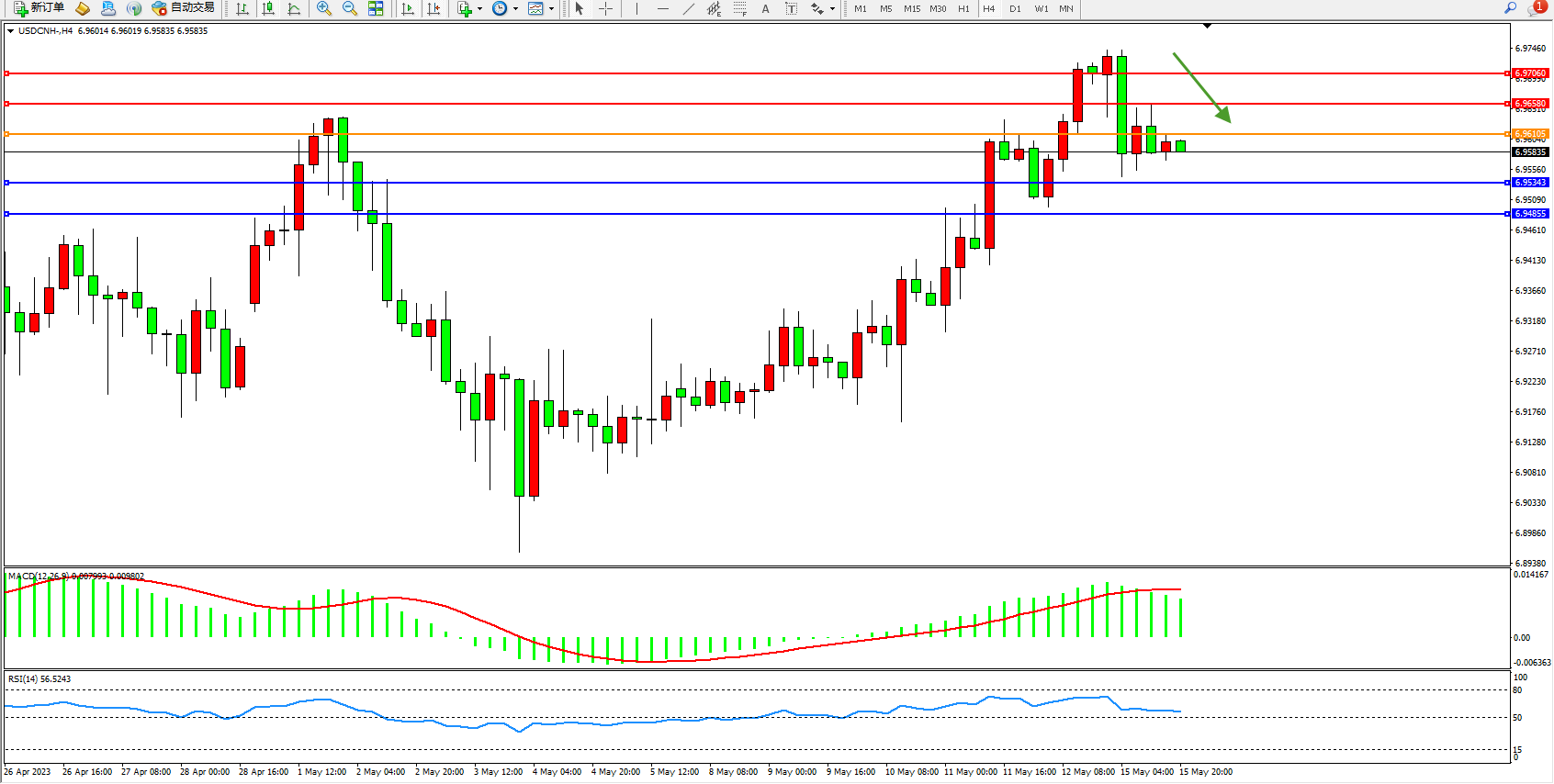 交易策略:6.96105下方看跌,目标6.95343 6.94855