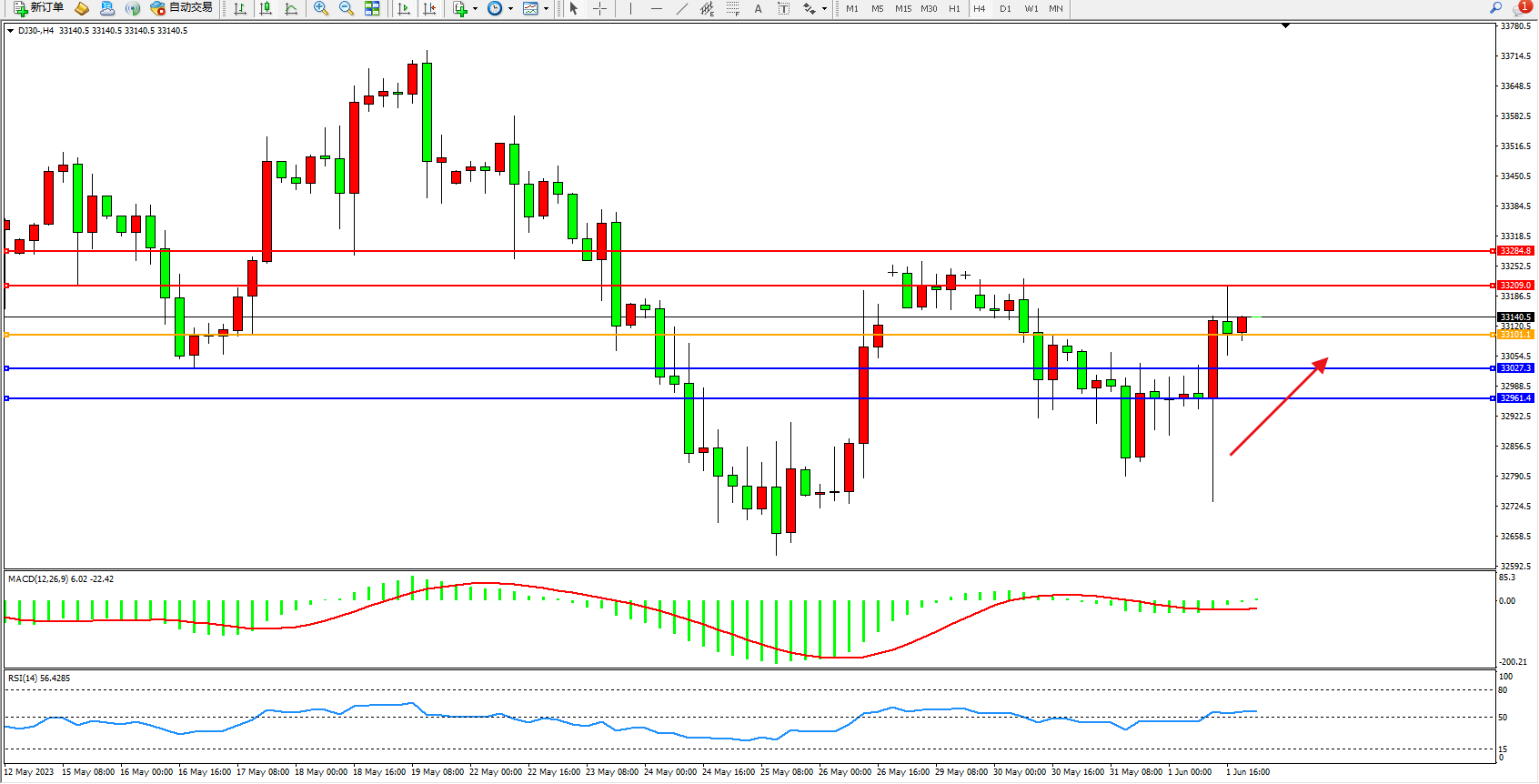 道琼斯指数DJ30——4小时K线图显示: