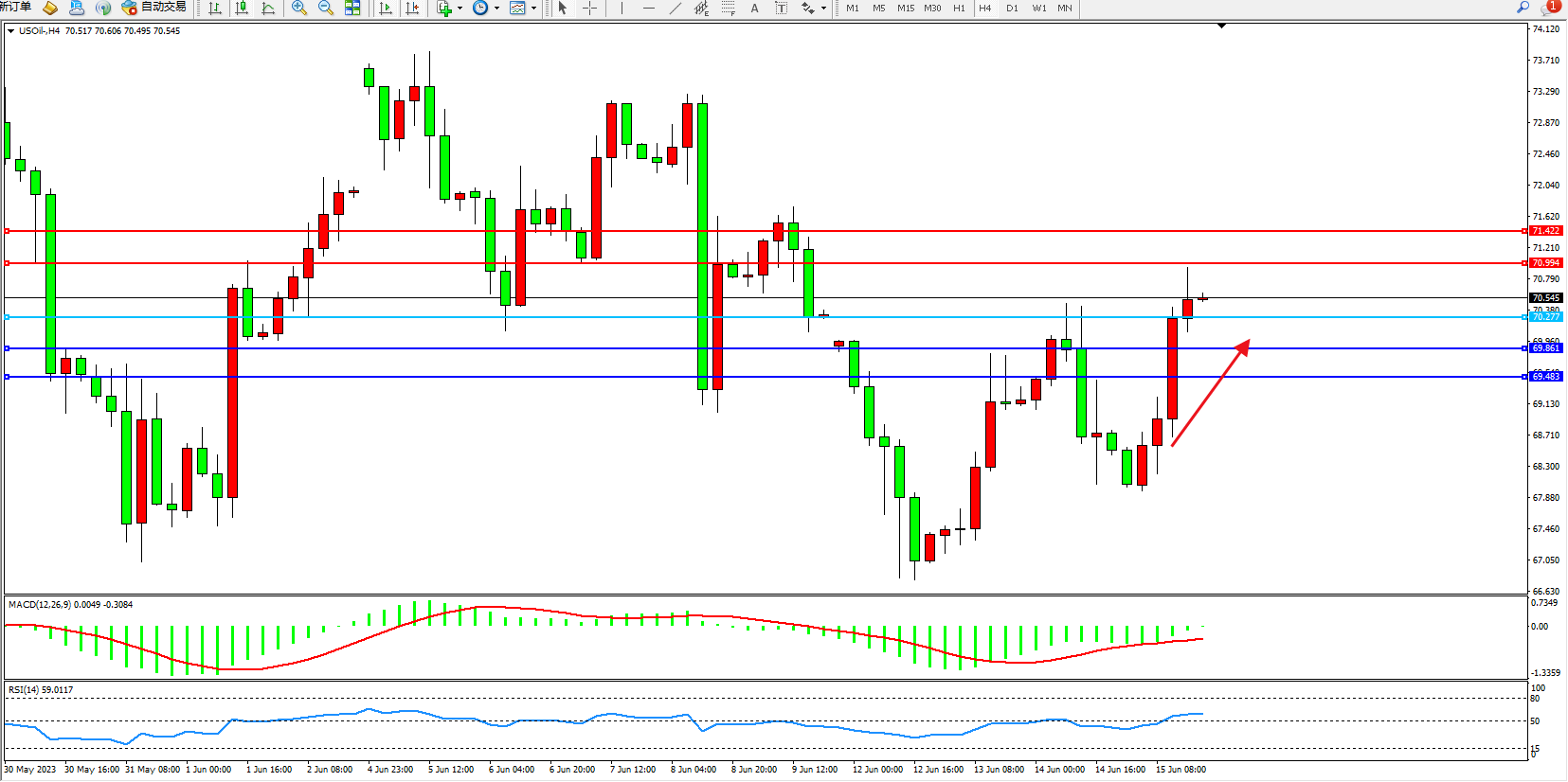 原油USOil——4小时K线图显示: