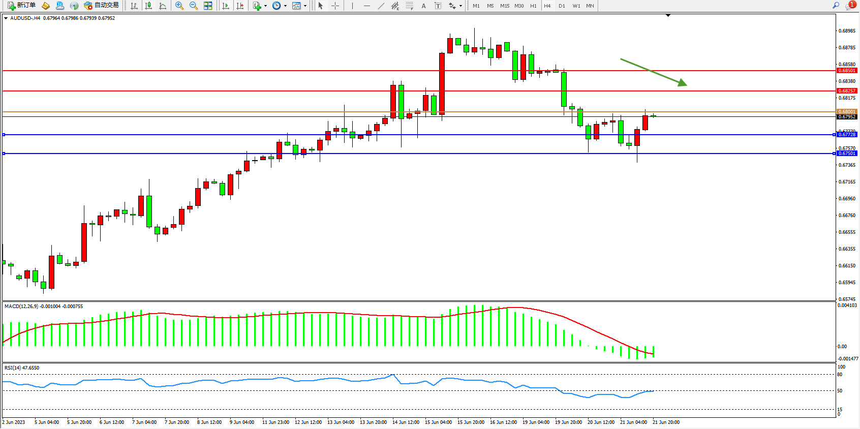 交易策略:0.68001下方看跌,目标0.67728 0.67501