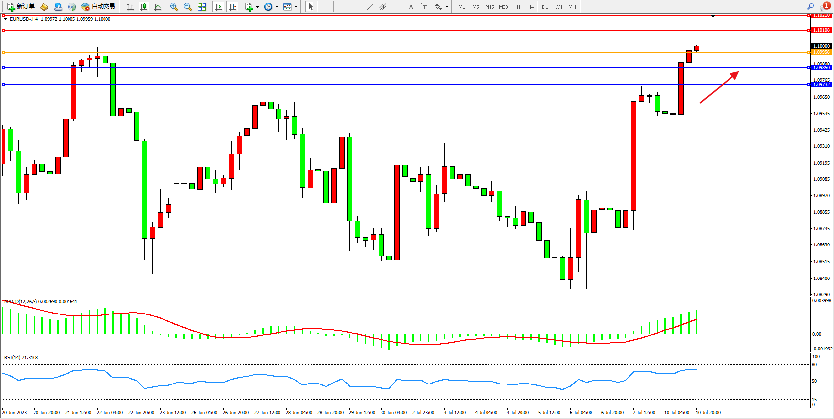 欧元美元EURUSD—4小时K线图显示: