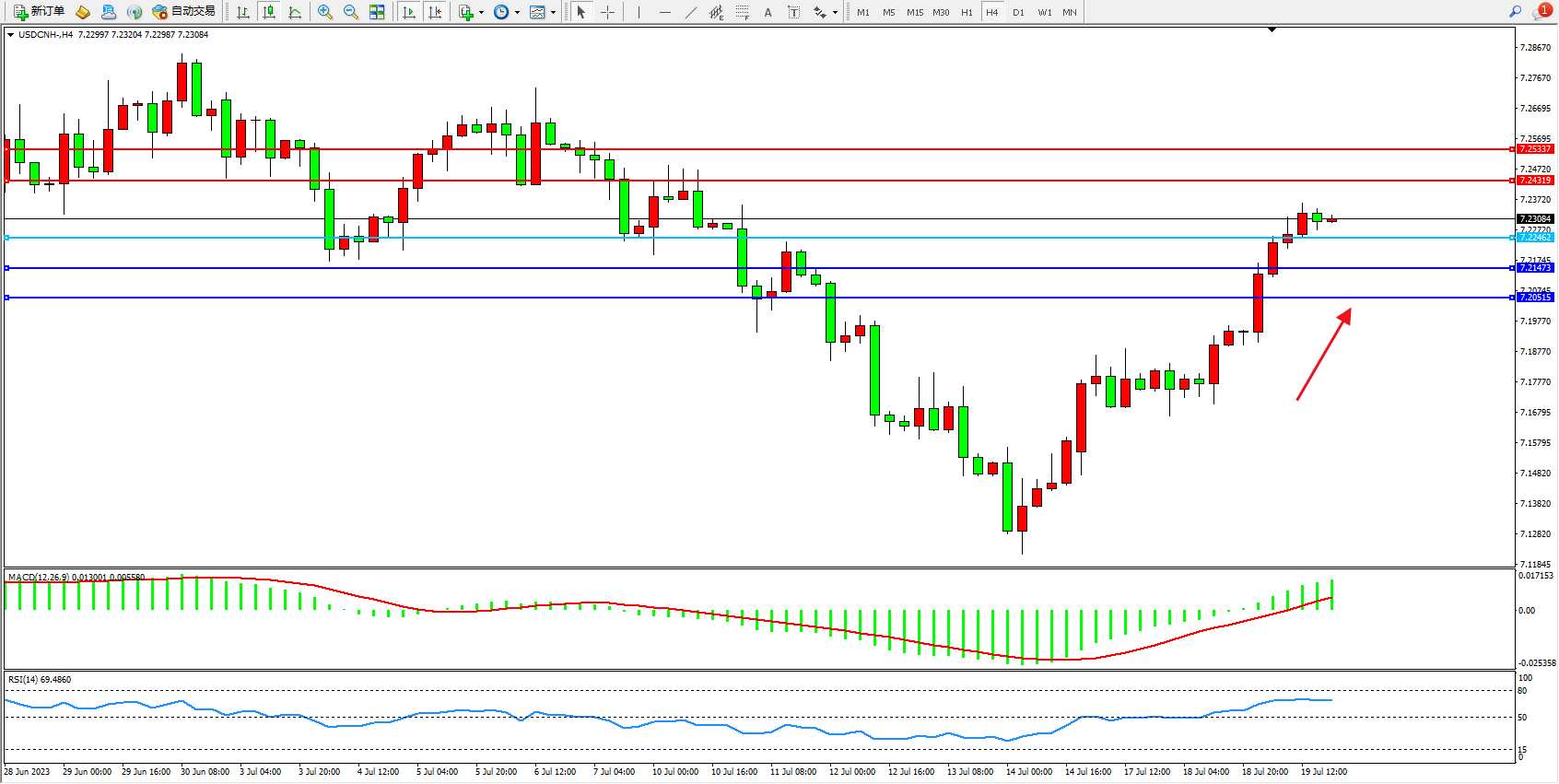 交易策略:7.22462上方看涨,目标7.24319  7.25337