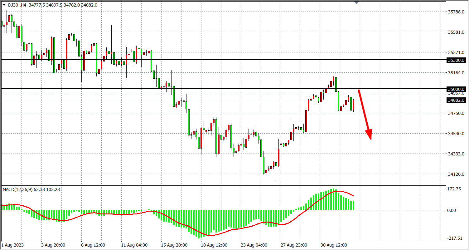 4小时图看,道指反弹35100附近后再度回落,MACD量能在零轴上有所缩量,短期多头走势偏弱,关注35000的阻力,下方看34600-34300附近。