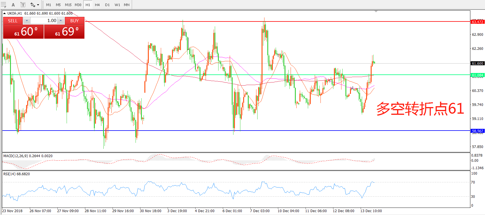 交易策略:在61.00之下看跌,目标58.00 55.00