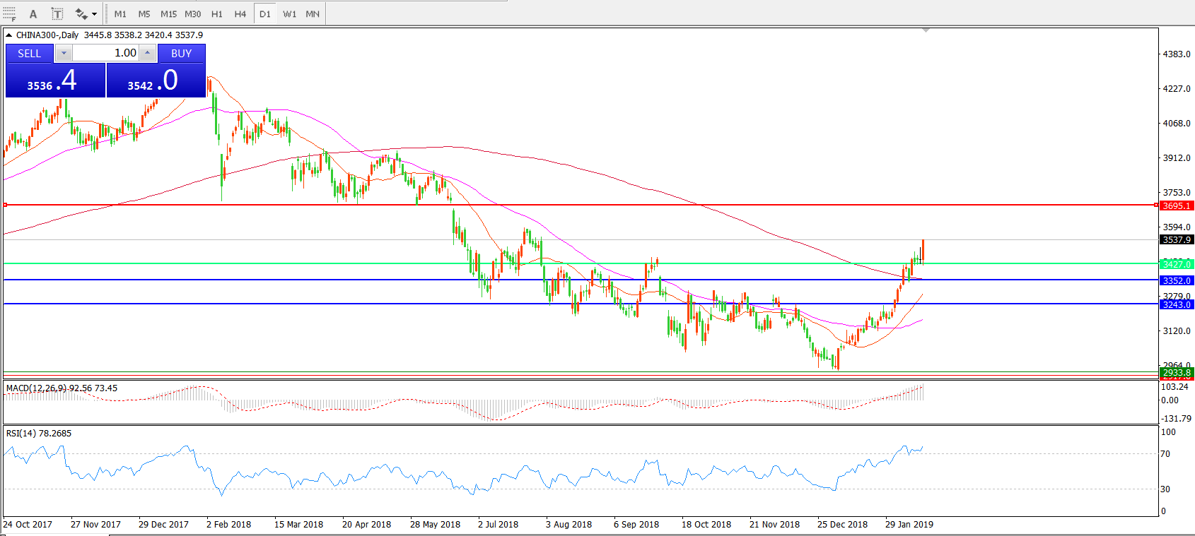日线图看中华指数已站稳200日均线,强势上行,短期运行十分强势,MACD红柱增加,RSI指标向上,后市上涨概率依然较大。