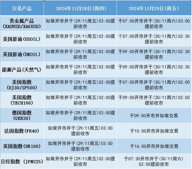 因应2024年11月28日(周四)及11月29日(周五)为美国感恩节假期,本公司以下产品的交易时间将于假期期间作以下安排,敬请留意。