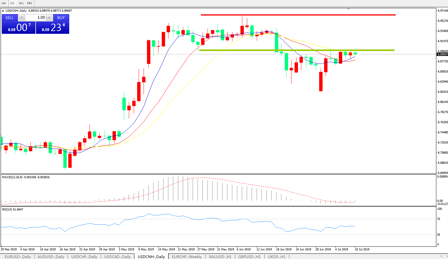 交易策略: 在6.9000之下,看跌,目标价位为6.8100,然后为6.7600。