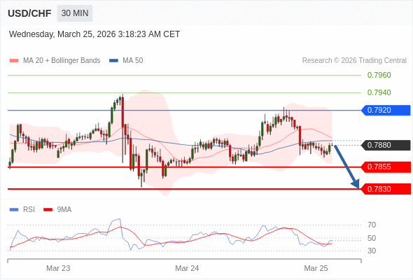 美元/瑞郎 当日内: 期待0.7855。