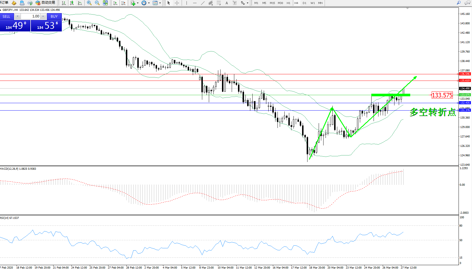 备选策略:133.575上方看涨,目标135.610136.546