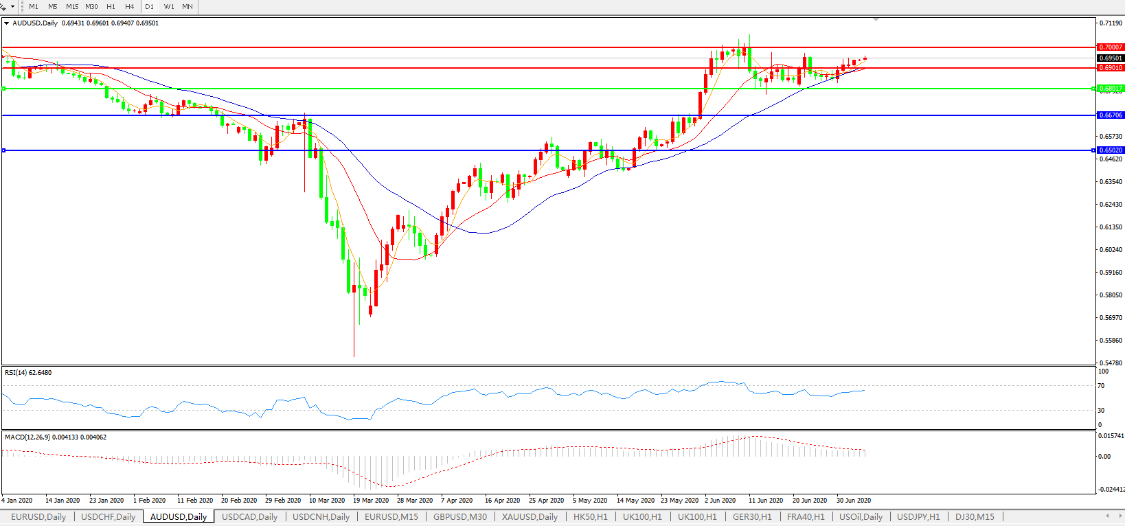 技术面简析:日图短期均线高位粘合走平,汇价持续窄幅整理略显强势,MACD运行于0轴上方且量能持续缩量,RSI有走升迹象,预计汇价短线大概率将继续上攻,关注0.7000 关口压制。