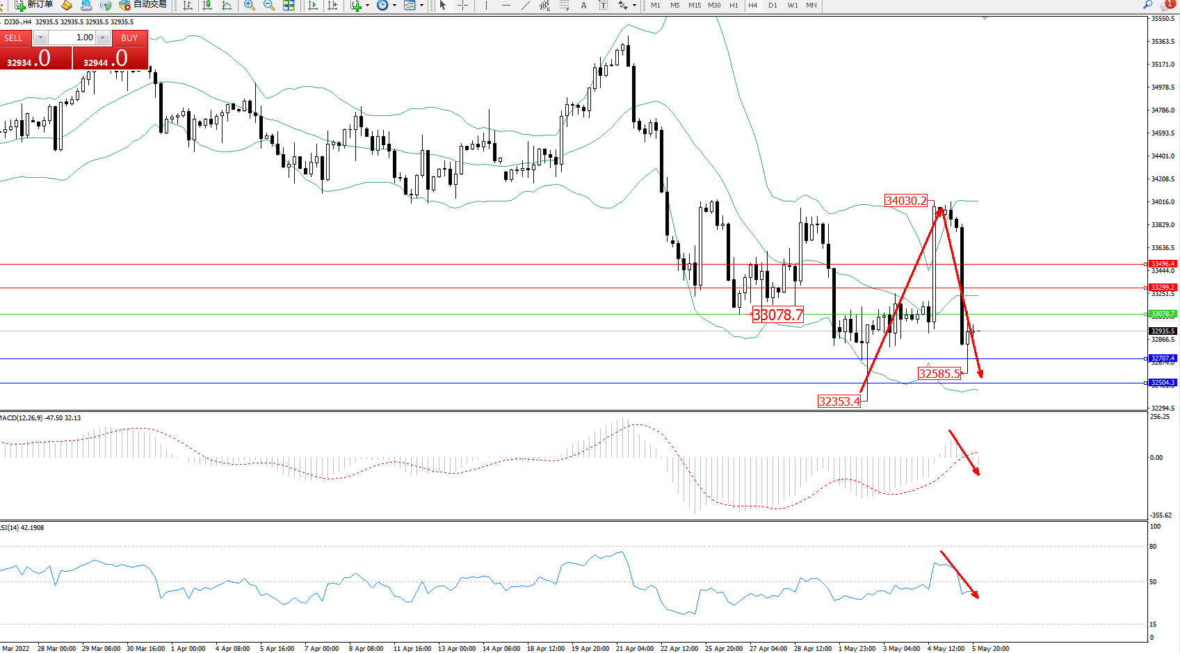 道琼斯指数DJ30——4小时K线图显示: