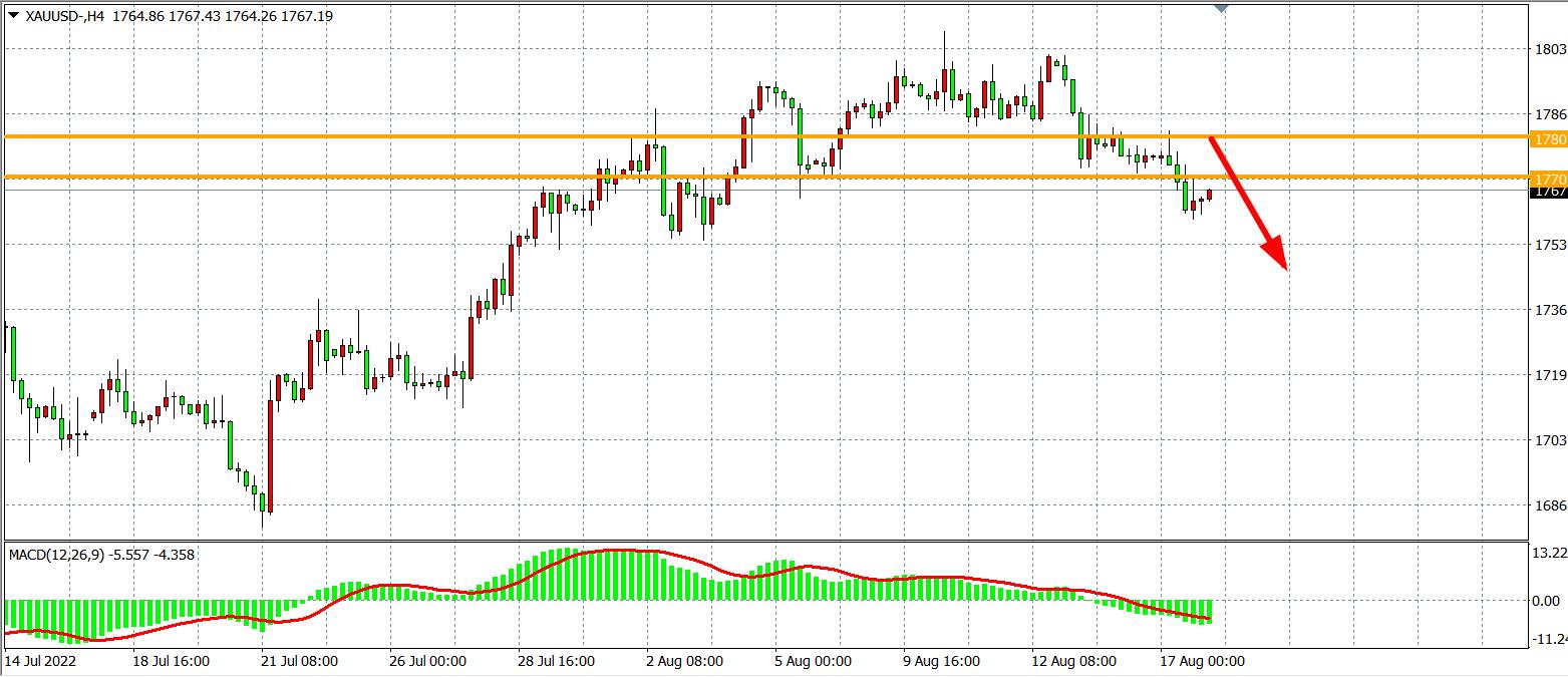 周三(8月17日)美国7月零售销售月率创2个月新低,美联储加息预期小幅下降,但美联储会议纪要“鸽中藏鹰”,“鸽”的是缺乏支持继续加息75个基点的线索,“鹰”的是美联储官员们支持持续加息。受此影响,十年期美债收益率重登2.9%上方,现货黄金涨至1782.16美元的日高后狂泻约23美元,一度跌破1760大关,最终收跌0.78%。