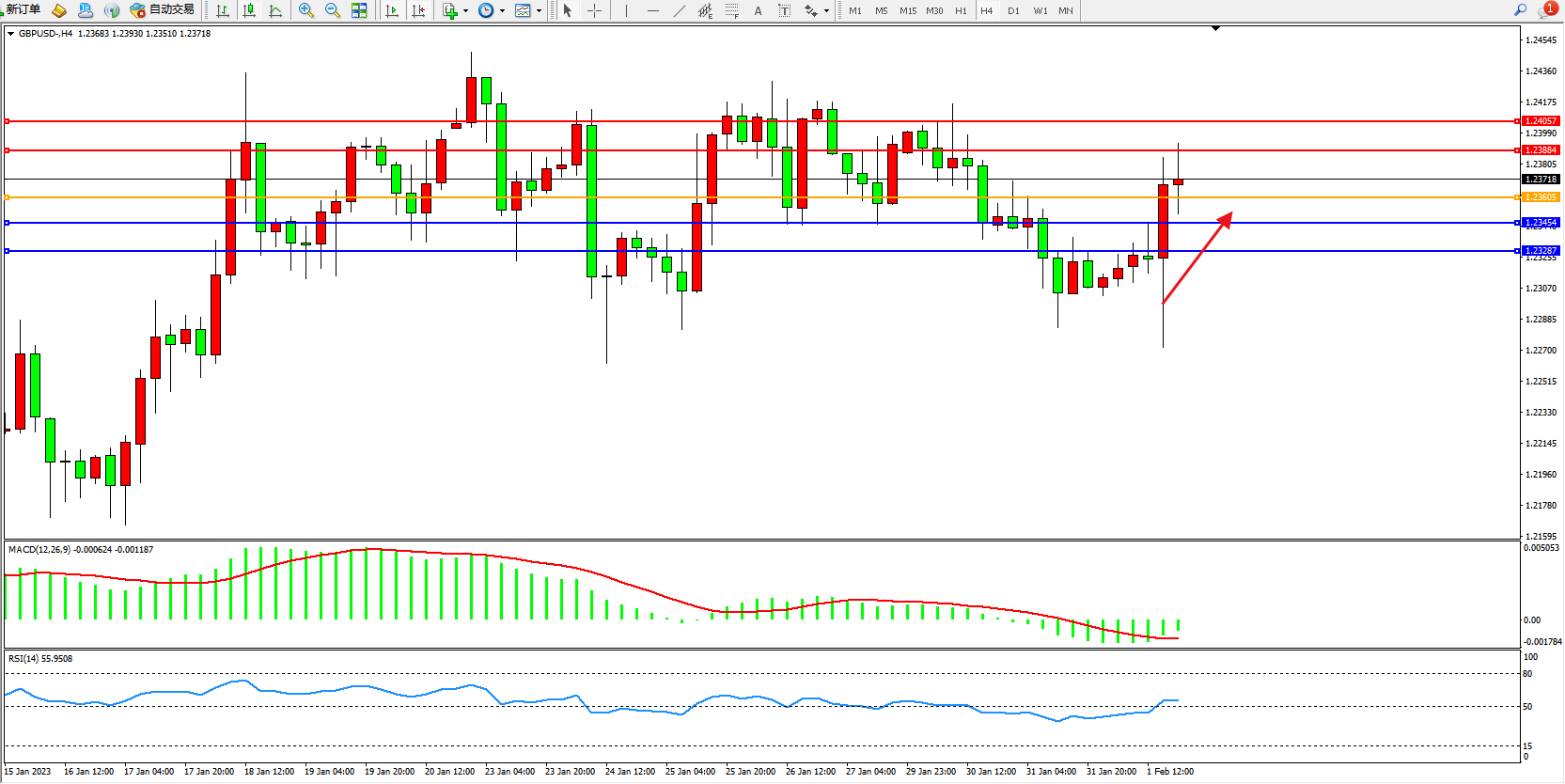 交易策略:1.23605上方看涨,目标1.23884、1.24057