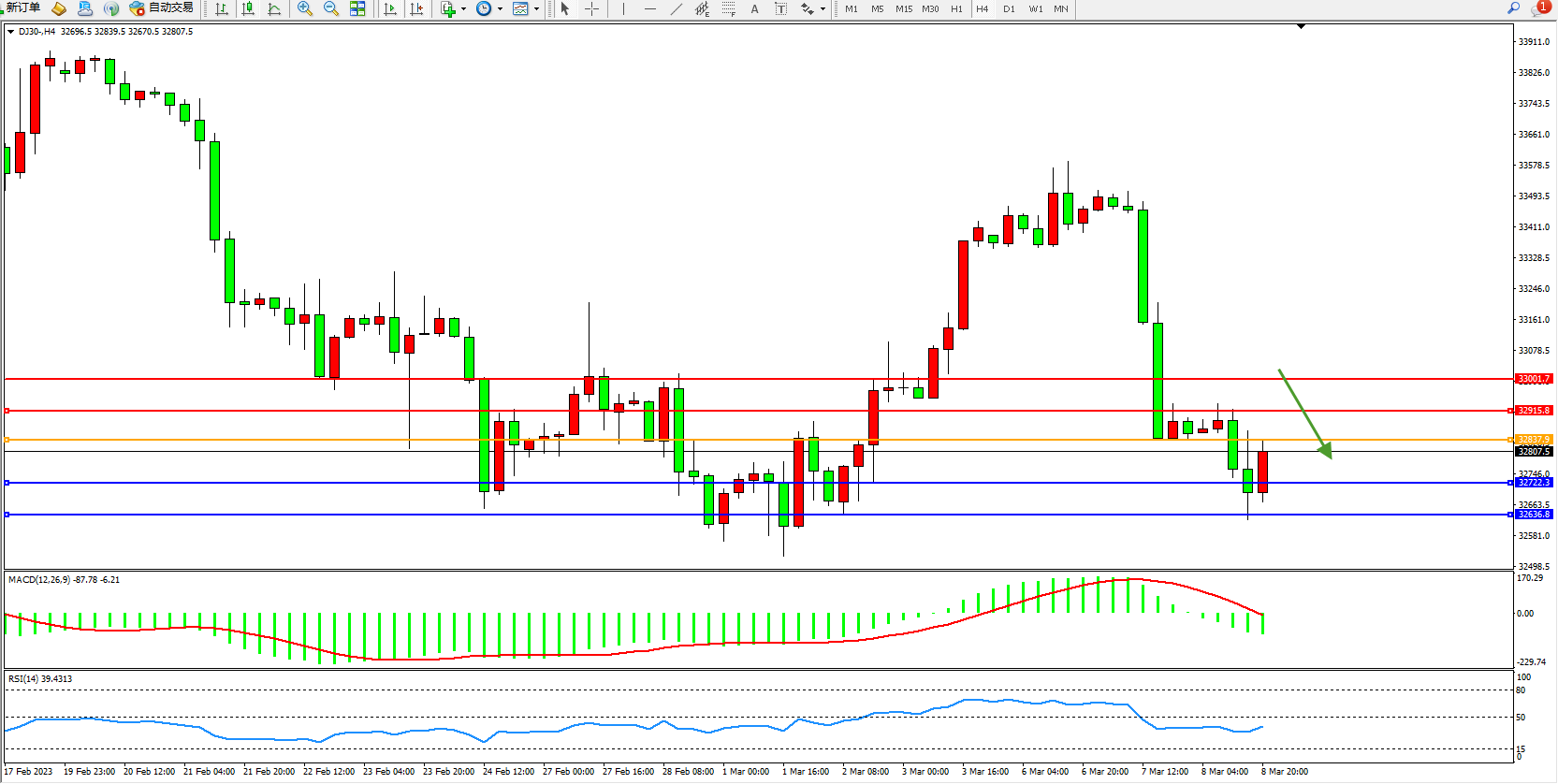 道琼斯指数DJ30——4小时K线图显示:
