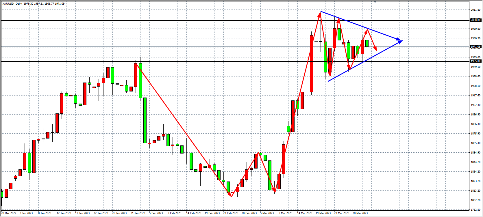 周三,美股全线大涨,同时恐慌指数VIX下跌3%,风险情绪进一步好转。这些价格走势都基本回到了3月9日美国硅谷银行流动性危机之前,反映市场已经摆脱了银行业担忧。在这种市场变化中金价受到不利影响,因为银行业担忧的消散意味着对黄金这种“终极货币”的避险需求减弱,金价自3月20日创新高后进入调整阶段,就是因为受避险需求减弱的不利影响。