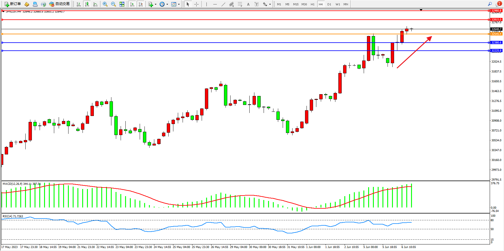 日经指数JPN225——4小时K线图显示: