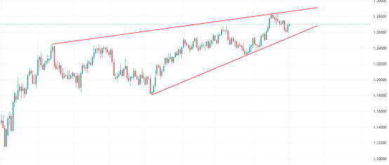 价格呈现高位震荡,市场多空方向不明,短期暂无破位信号,上方压制关注1.2885附近,低位支撑关注1.2600附近。上方阻力承压通道上轨,下方支撑逐渐抬高,属于典型的收敛形态,如图: